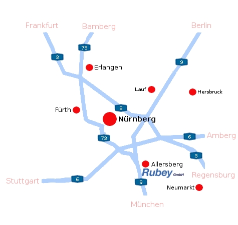 Die Rubey GmbH ist ortsansässig in Allersberg. Der Ort befindet sich direkt an der Autobahn A9, Ausfahrt 55.